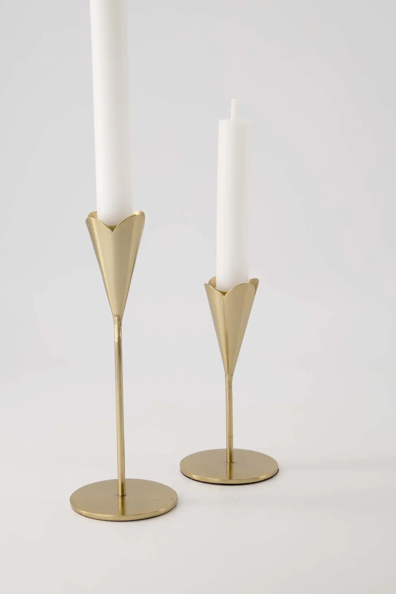 De kandelaar meet 19 x 7 cm. Gemaakt van metaal.