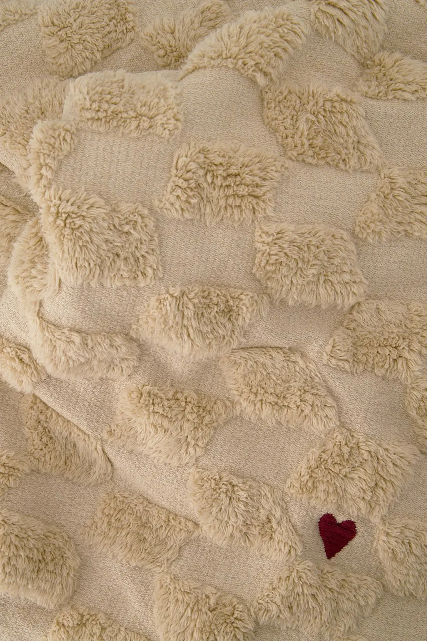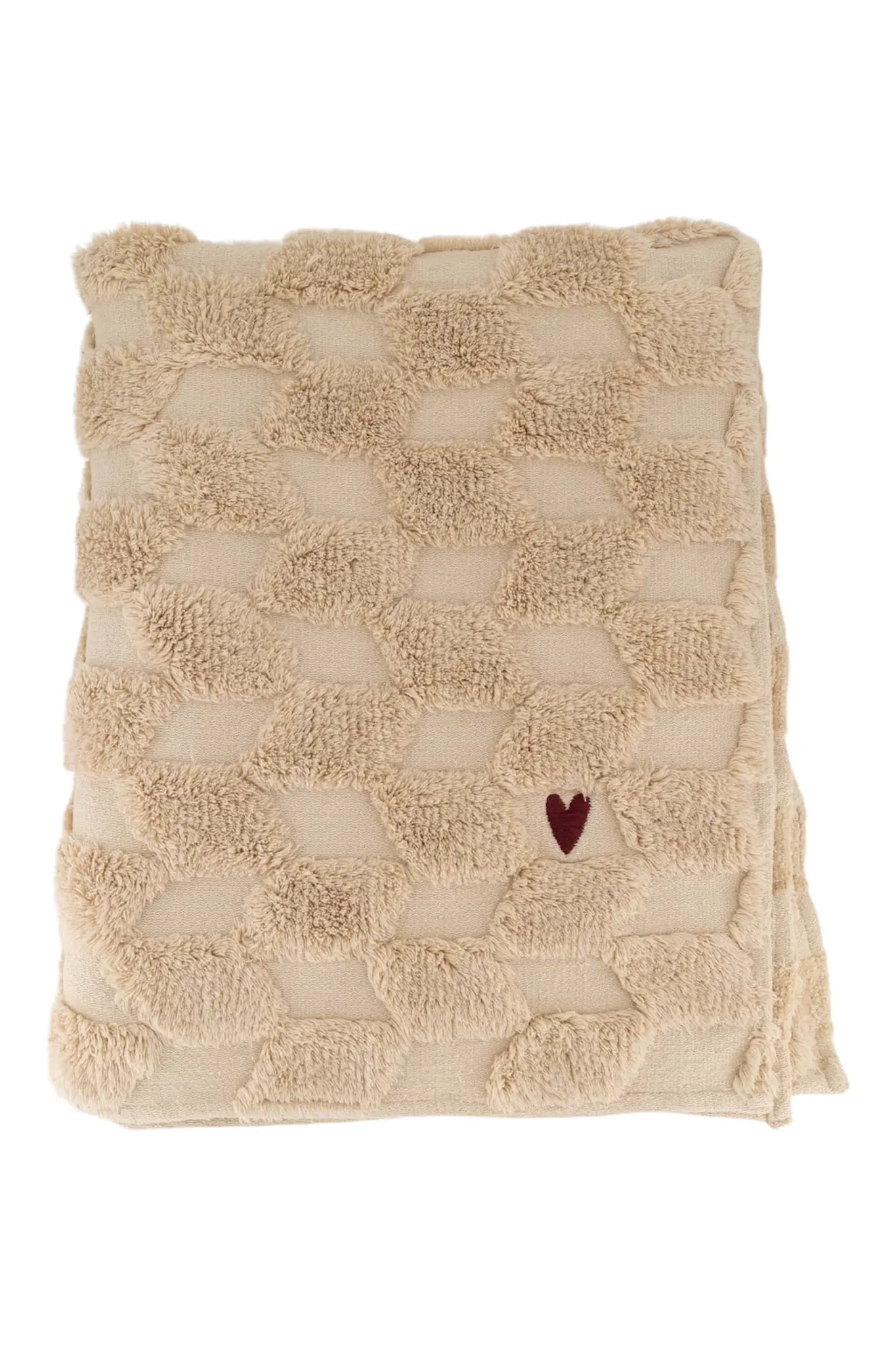 Deze plaid met reliëf-effect heeft zacht geborduurde hartjes in ecru. Hij past perfect in jouw zetel of over je bed. Combineer hem met Zusss kussens. Of geef hem cadeau aan je bestie, zus, mama,... dat doet altijd plezier. De plaid is heerlijk zacht en perfect voor koude herfst- en winteravonden. Als accentje heeft het deken een schattig rood hartje.