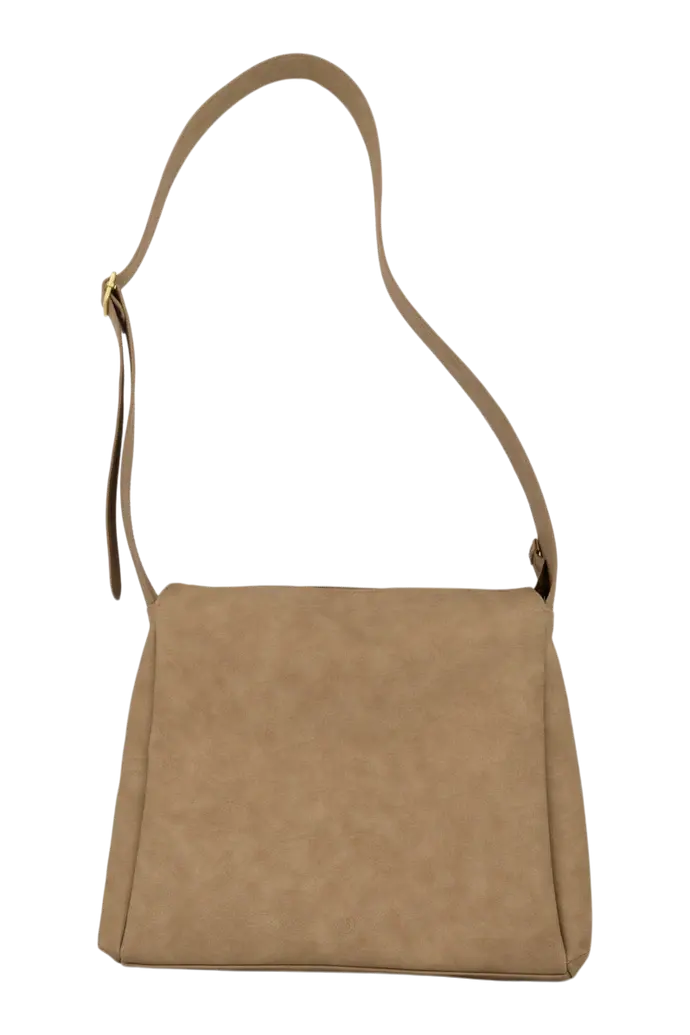De ruime schoudertas in taupe is gemaakt van 100% PU en heeft een extra brede riem.