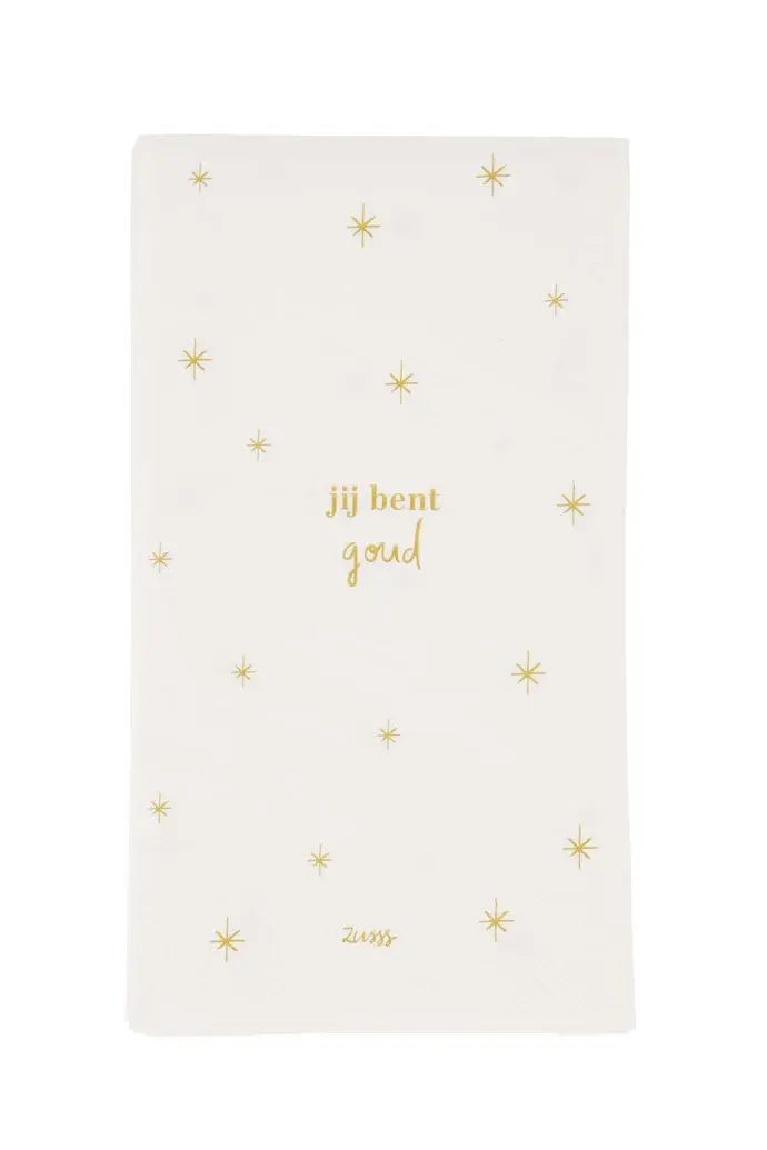 Maak je tafel extra gezellig met deze rechthoekige servetten met van Zusss. De witte papieren servetten hebben hebben als tekst 'Jij bent goud' met een achtergrond van gouden sterren.