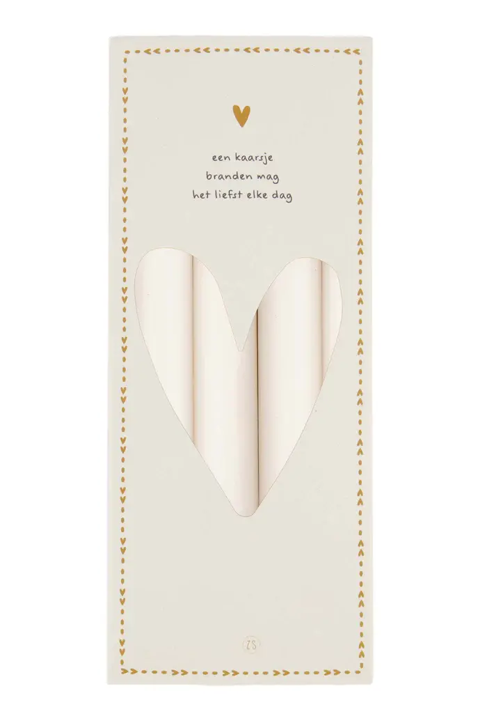 Dit doosje kaarsjes is altijd handig om in huis te hebben. Ze hebben de kleur off-white en zitten in een leuk doosje met de tekst 'Kaarsjes branden mag, het liefst elke dag'.