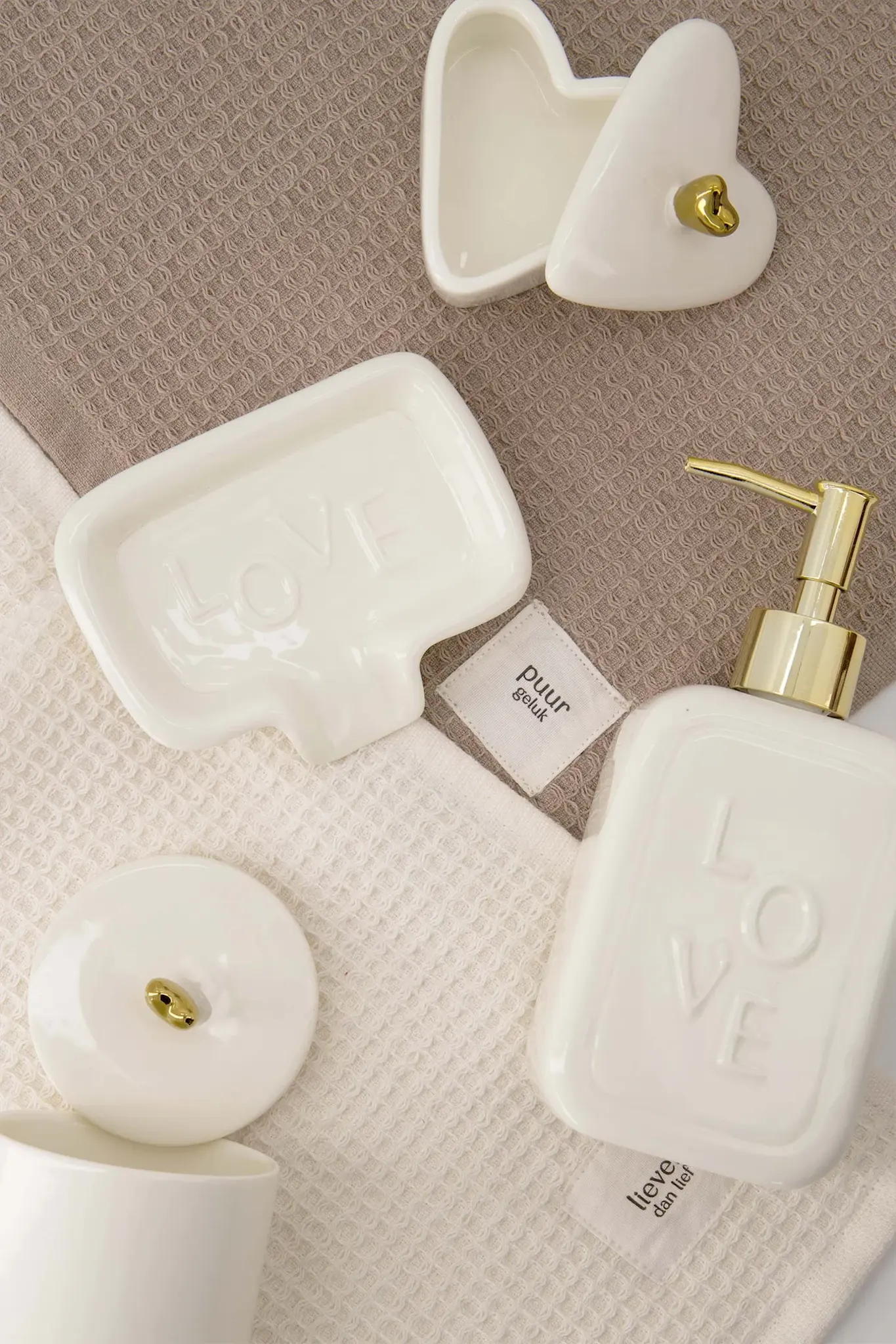 HuisparfumsVerlichtingKussens en plaidsMeubelsBadkamerDeurmattenBeschrijvingZUSSS ZEEPSCHAALTJE KERAMIEK LOVE WIT/GOUD